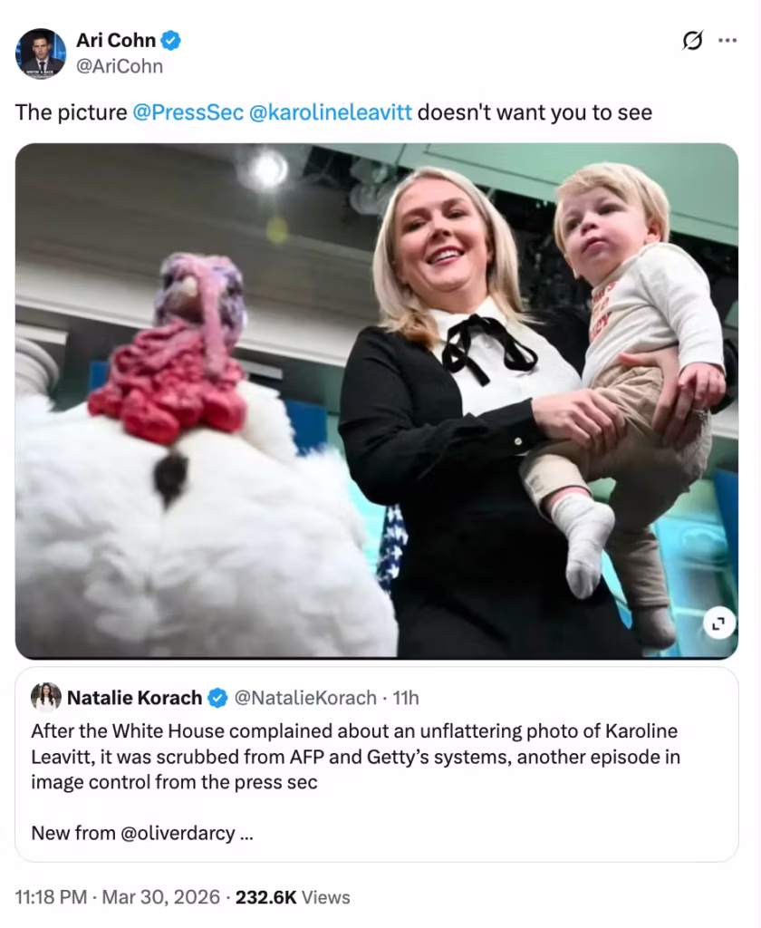 The New Republic reports, “On Tuesday, Status reported that White House press secretary Karoline Leavittt hated a November photo of her, her young son, and a turkey so much that she reached out to Agence France-Presse and had it removed from their archive, which removed it from Getty as well.”